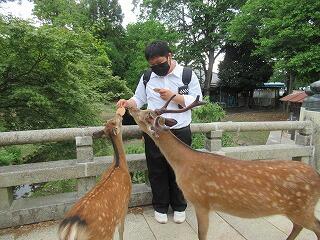 奈良公園では鹿を近くで見ることができました。ホテルでは友達と仲良く交流しました。
