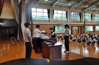 始業式の次は表彰式です。夏に行われた県大会やコンクールの表彰が行われました。
