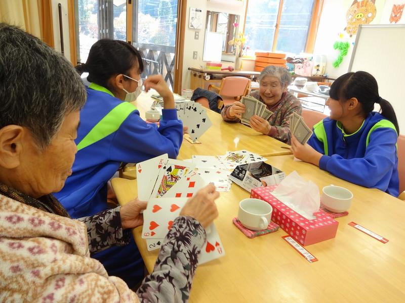 福祉ボランティアは初めてという生徒ばかりで、始めの頃は利用者の方々とどのように接したらよいか戸惑っていましたが、余暇活動でオセロやトランプ、パズルなどで交流していくうちに打ち解け、談笑する姿が見られるようになりました。