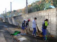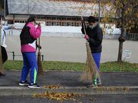 地域や学校を自分たちの手できれいにしようと、小中学生が、校庭や道路の落ち葉はきをしています。