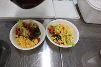 三色野菜炒めとスクランブルエッグの完成です。